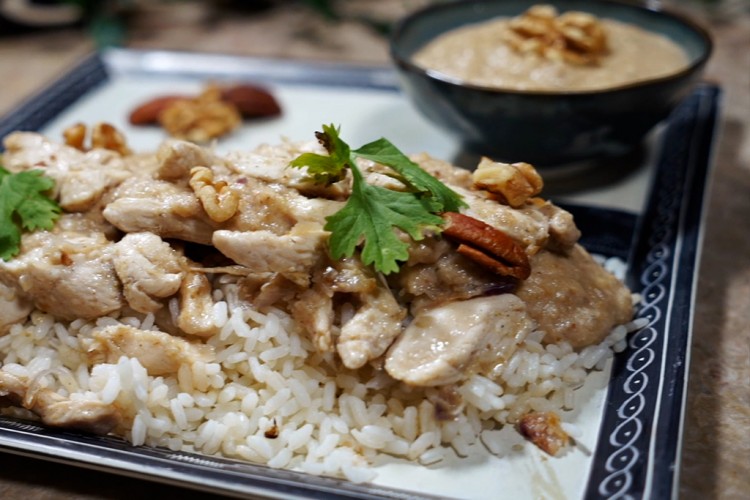 - للتقديم: في طبق التقديم، ضعي طبقة من الأرز المطبوخ، وشربيه بالقليل من صوص الجوز، وضعي قطع الدجاج على الوجه.