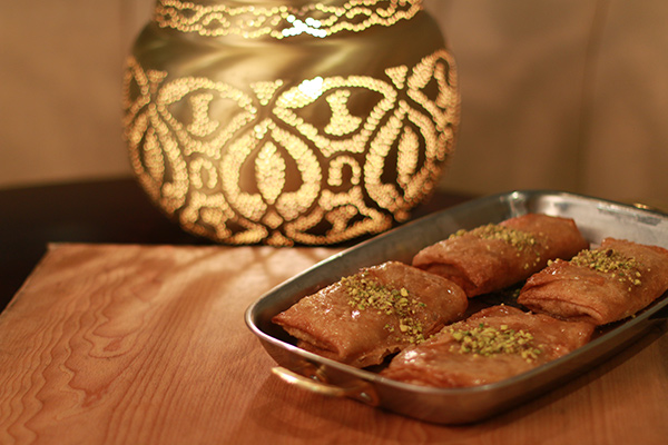 3. تصفى قليلا من القطر وتزيين بالفستق وتقدم ساخنة.