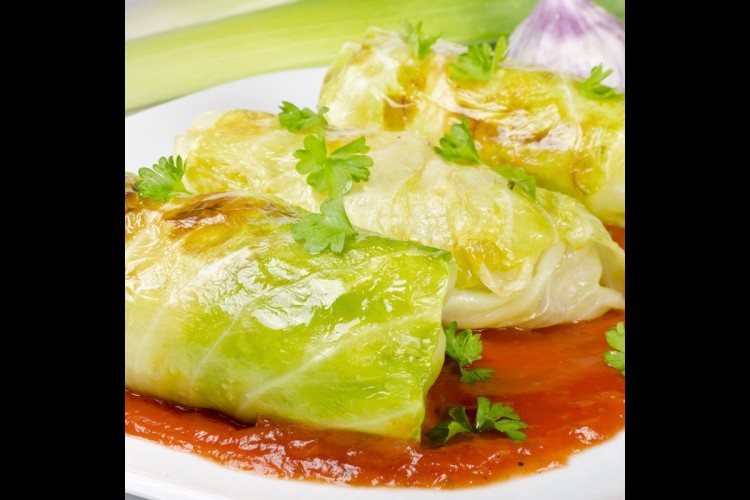 4. تُحشى حبات الملفوف وتلفّ. وتضاف إلى وعاء مخصّص للفرن، مع 3 ملاعق من الماء الساخن والصلصة. يغلّف الوعاء، ويخبز لمدة ساعة في الفرن.