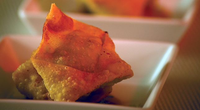 يُسخن الزيت حتى تصل درجة حرارته إلى 180 مئوية. تُحضر الوونتون بينما يسخن الزيت. تُفرد لفافة من الوونتون على سطح الطاولة، وتوضع ملعقة صغيرة واحدة من الحشو في المنتصف، ثم تُطوى الوونتون لتأخذ شكل القبعة، مع دهان الأطراف بالماء لإحكام الإغلاق.