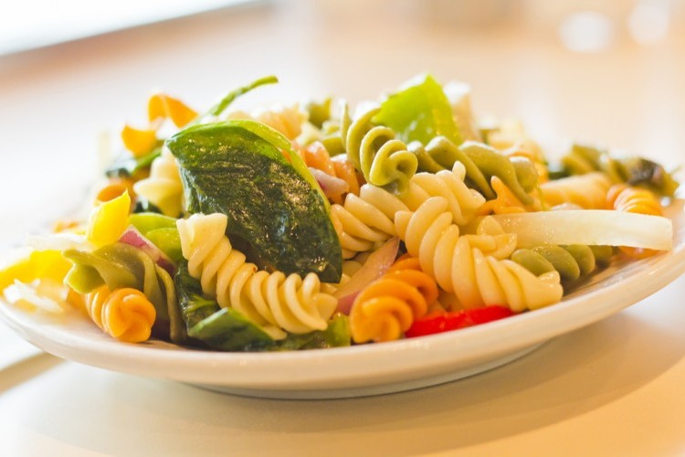 - نضع الباستا في صحن ثم نضيف لها الخضراوات والجبن ونقلب جيداً حتى يمتزجوا تماماً.