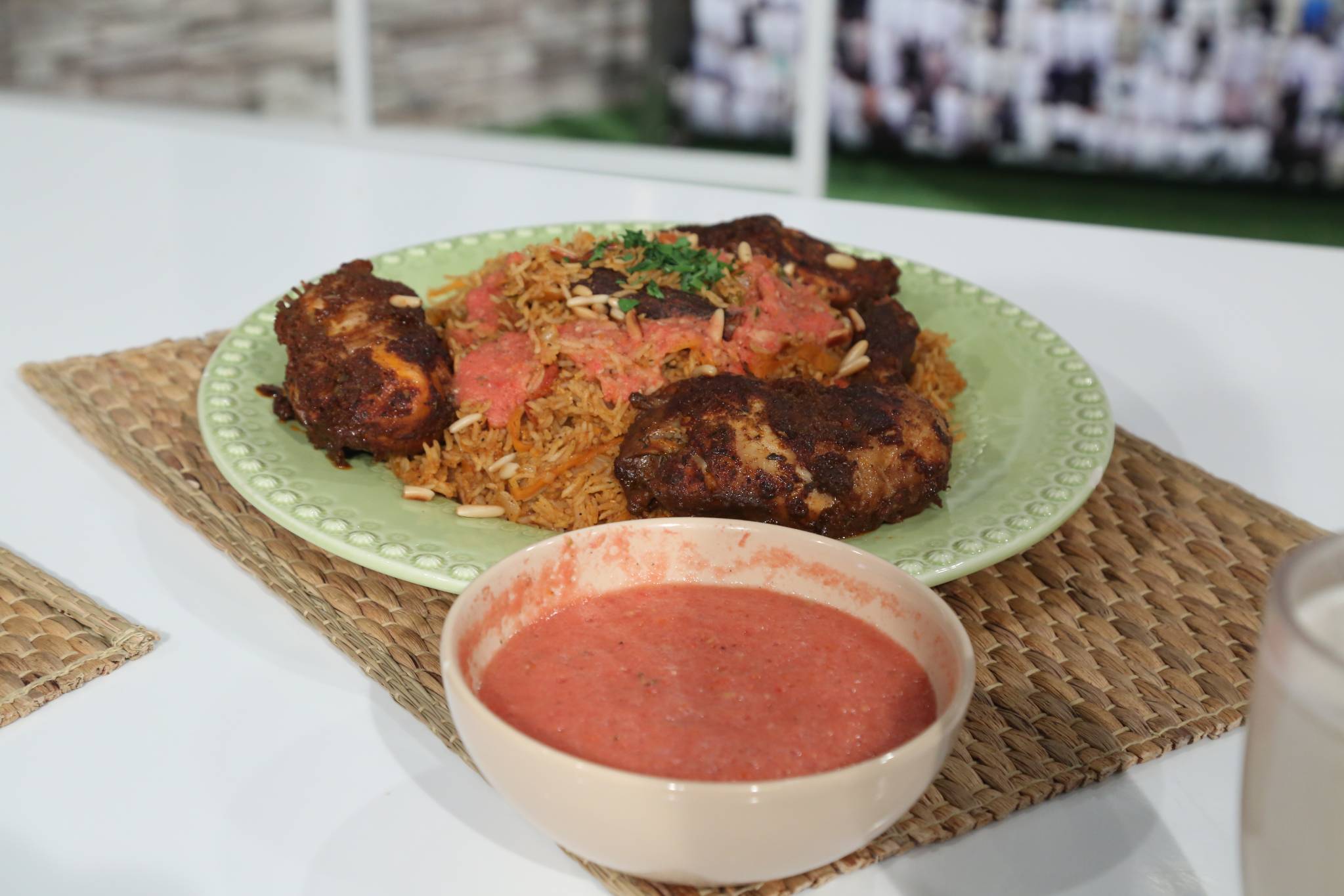 يقدم الارز مع الدجاج و يضاف إلية كمية من الصلصة و اللوز و الصنوبر المحمص