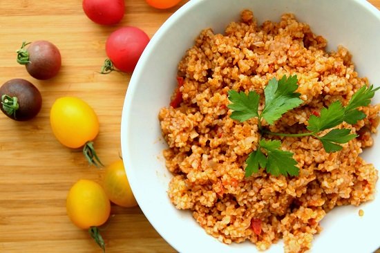 - اسكبي البرغل ساخناً في طبق التقديم، وبجانبه قدمي معه الزبادي.
