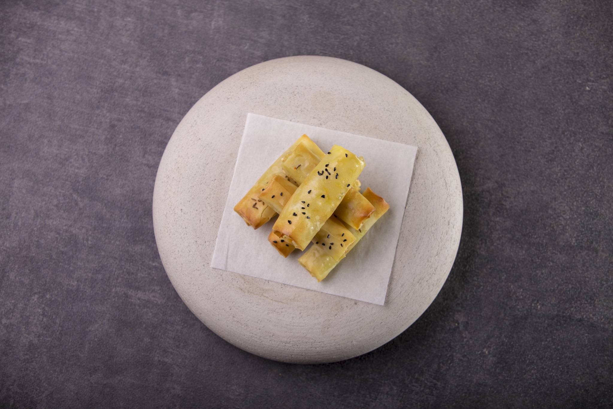 يضاف 1-2 ملعقة صغيرة تقريباً من مزيج الجبنة على طول الرقاقة، مع ترك ¾ بوصة من كل جانب، ثم تلف إلى لفائف