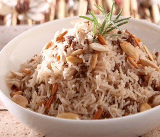 - اسكبي الأرز المطبوخ في طبق التقديم وزينيه باللوز والصنوبر المقلي.