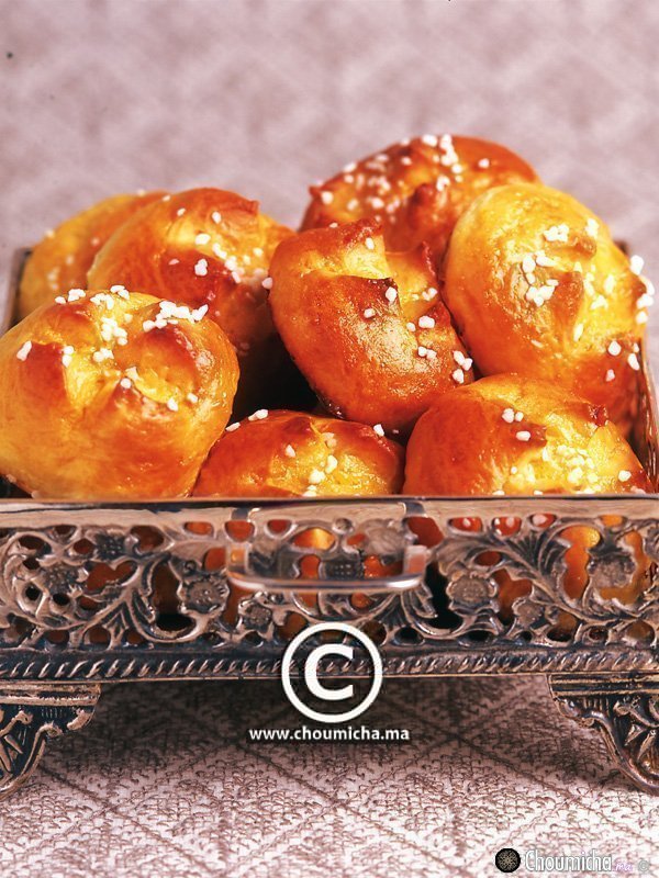 - تشكل كويرات عجين متوسطة الحجم، توضع فوق صفيحة ملبسة بورق المطبخ، تدهن بالبيض المخفوق وتترك تخمر مجددا في مكان دافئ.