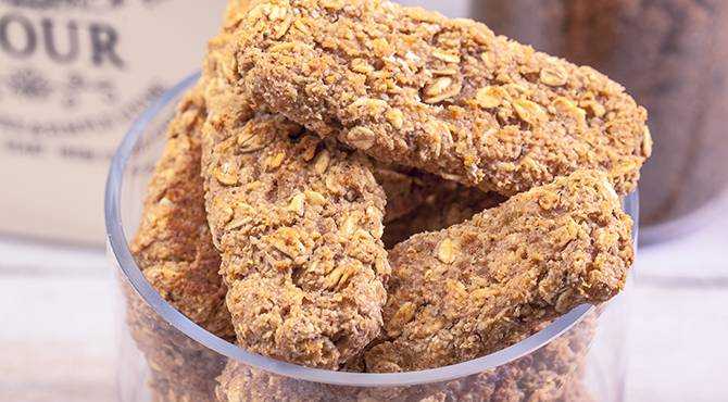 تشكل على شكل مستطيل وتوضع على صينية خبز مبطنة بورق الزبدة، تخبز بحرارة 180 درجة مئوية لـ30-45 دقيقة، اعتماداً على نوع الفرن. تقلب حتى منتصفها بحيث نحصل على قشرة ذهبية لكلا جانبي البسكويت.