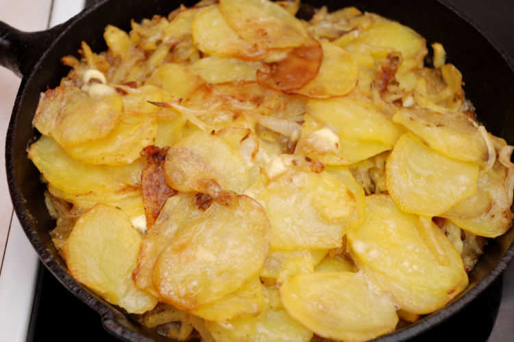 5. أدخلي الصينية للفرن لمدة 30 دقيقة حتى تتحمر البطاطس وتنضج مع البصل.