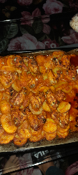 - نخلط البهارات ونضع الصوص مع البطاطا والدجاج ونتركها تتشرب الصوص.