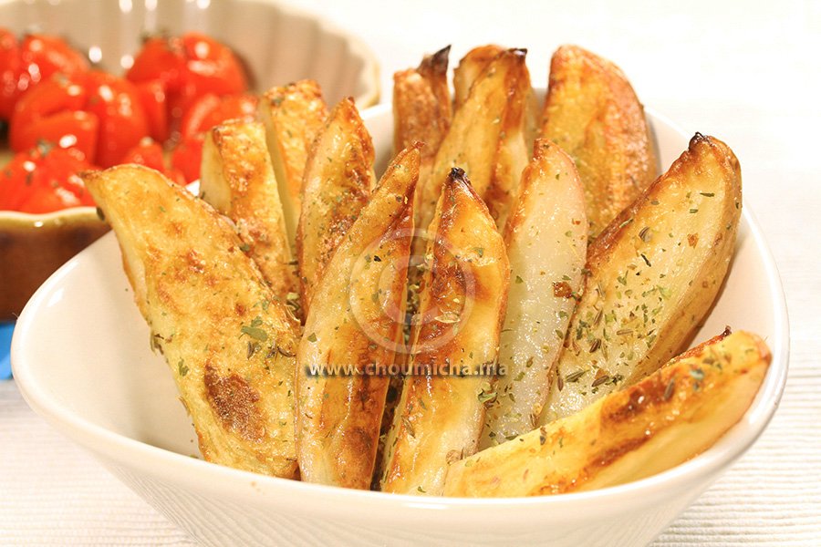 - تطهى البطاطس في الفرن المسخن على درجة الحرارة 170 لمدة 45 إلى 50 دقيقة مع إدارتها على الجهتين كل 15 دقيقة حتى تتحمر.