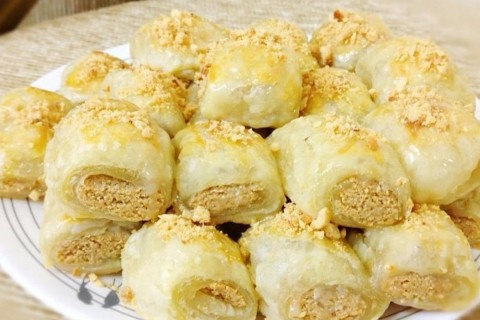 - ثم نحضر شرائح الباف باسترى وبواسطى فرشاة تدهن بالزيت وتحشى كل شريحة بمعلقة من خلطة الشعرية ثم تلف شريحة الباف باسترى.