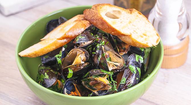 يضاف البقدونس المفروم ويحرك مع البلح ثم يصب بلح البحر والمرق في أوعية. تقدم مع الخبز المحمص.