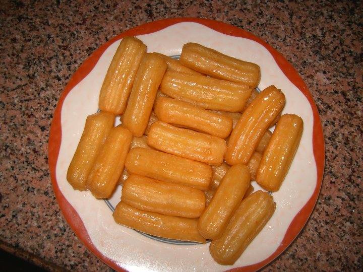 ٣. يوضع العجين في الكيس المزود بالقمع، يضغط علي الكيس حتى ينزل العجين في الزيت المغلي وتأخذ الشكل الذهبي.