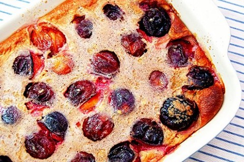 - نضع البرقوق فى صينية مدهونة بالزبد ونضع فوق البرقوق خليط الدقيق .