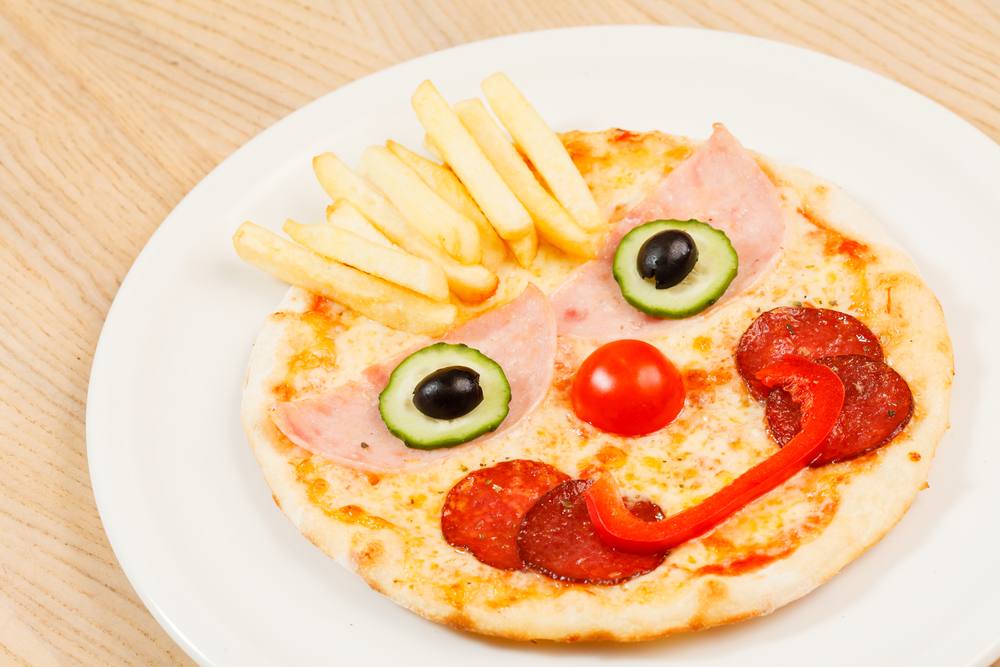- وتوضع عليها الجبنة المبشورة والفلفل الأخضر نرتبه بشكل وجه والزيتون للعينين .