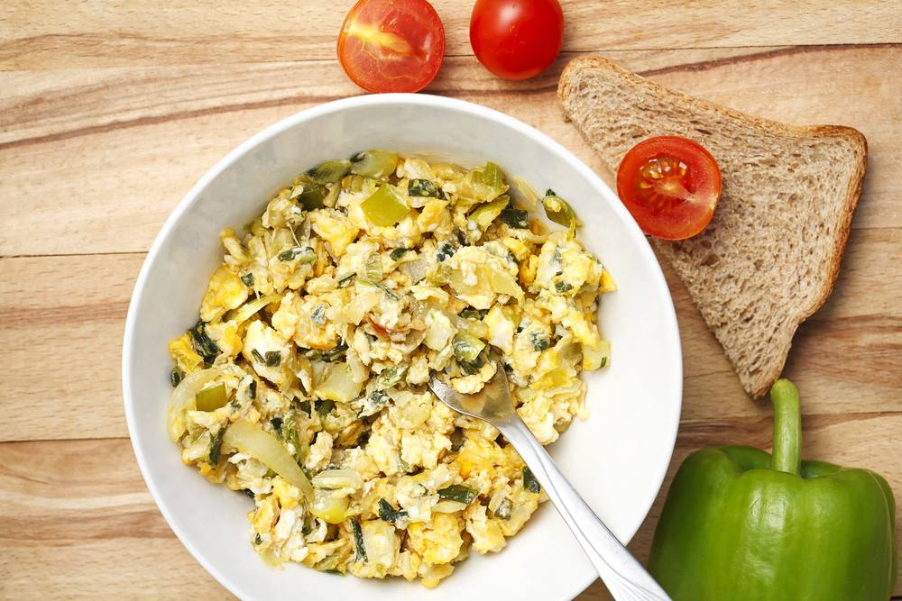 - أحضري مقلاة أخرى، ضعيها على النار على حرارة متوسطة ثم أضيفي ملعقتي الماء، الملح، الفلفل الأسود، ملعقة من الزيت النباتي، أضيفي الخضروات وعليها البيض المخفوق واتركيه لمدة دقيقتين.