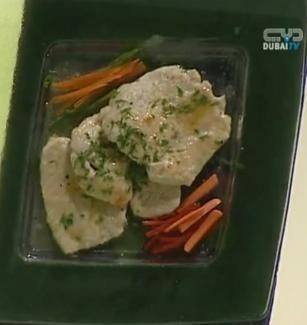 - ضعي قطع الرومي في طبق التقديم وفوقه الصلصة والبقدونس والخضروات ويقدم ساخناً .