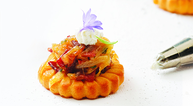 تُغرف 1 ملعقة صغيرة من البصل المكرمل في كل قاعدة تارت ويُشكل على شكل دائري ويضاف القليل من الكريمة الحامضة على الوجه. تُقدم دافئة.