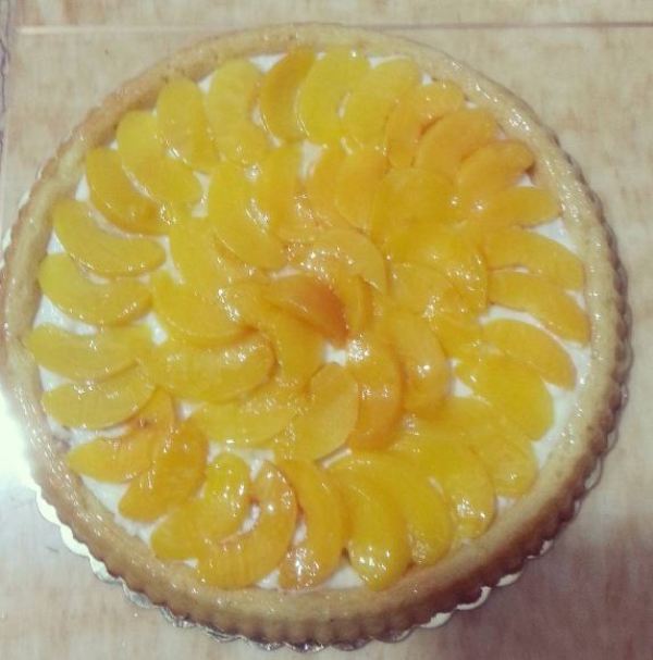 5. توضع شرائح الخوخ على القاعدة. يُصب الحشو، ثم تُخبز التارت في فرن ساخن لمدة 45 دقيقة.