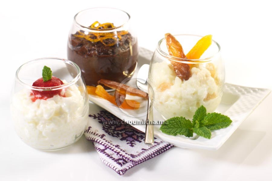 يقدم الأرز بالشكلاطة في كؤوس ويزين بقشرة البرتقال المعسلة.