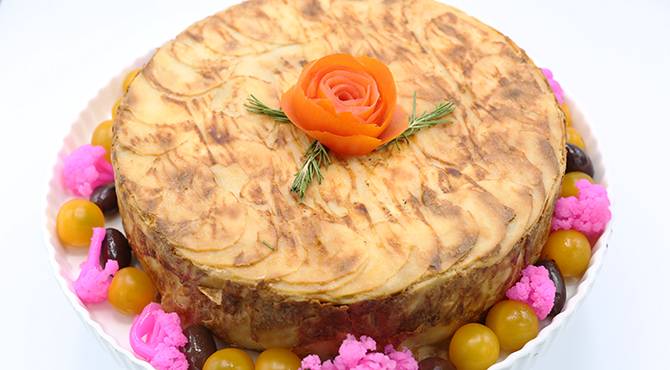 على طبق التقديم أقلبي قالب البطاطس، وابعدي ورق الزبدة من السطح والجوانب ثم قدميها.