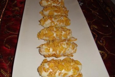 - نقوم بتسييح الشيكولاته البيضاء وبعد النضج توضع الأصابع في الشيكولاتة ثم في الكورن فليكس.