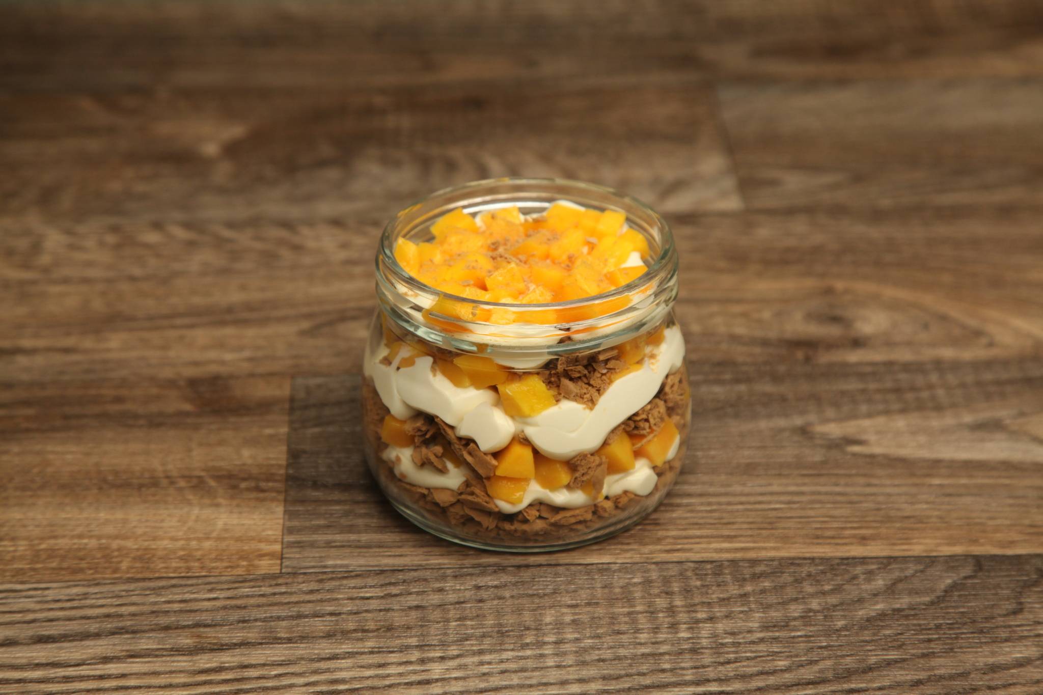 تكرر العملية لصنع 2 أو 3 طبقات وتكون الطبقة الأخيرة مكونة من الكريمة والمانجو. يرش بسكويت الجراهام المفتت على الوجه.