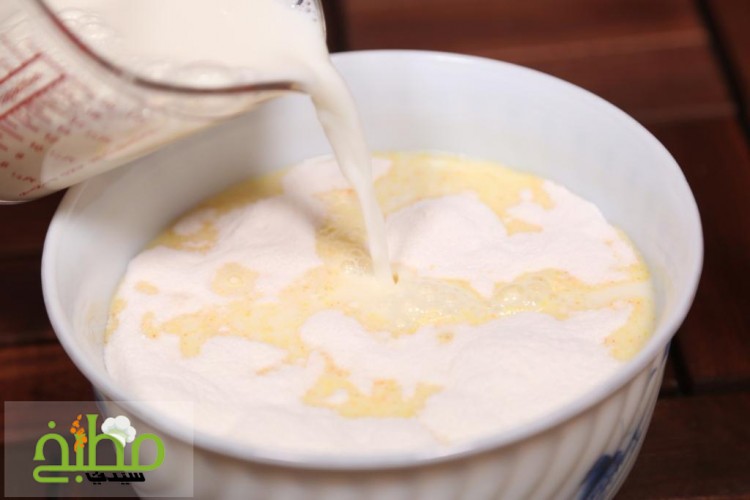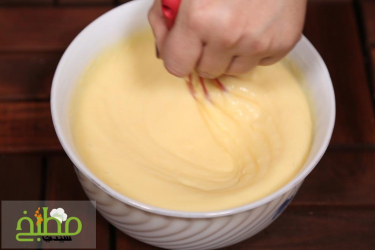 الخطوة الثانية Step 2 اخلطي البودينغ مع الحليب البارد بسرعة بواسطة الخفاقة اليدوية حتى تمتزج المكونات ويصبح المزيج سميكاً