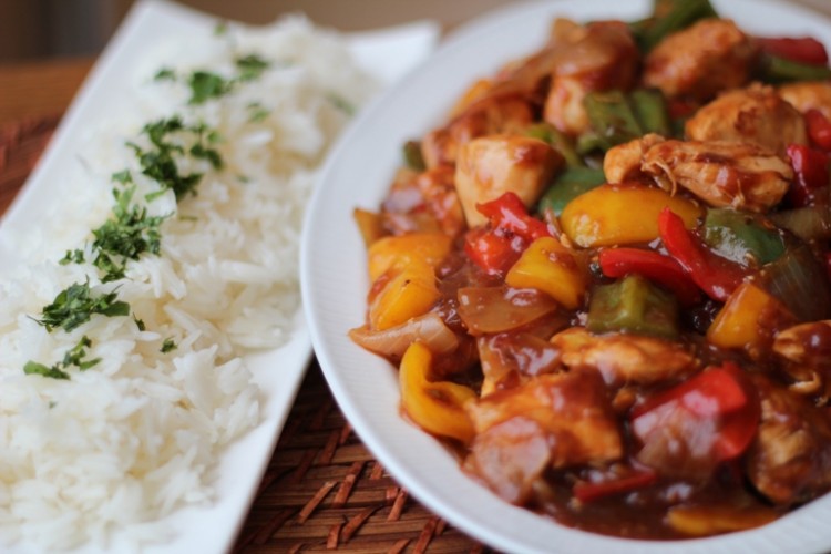5. نصب خليط الصلصة فوق الدجاج والخضار ويترك قليلا على النار ويقدم ساخنا إلى جانب الأرز الأبيض.