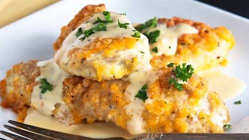 - تقطع الصدور الي شرائح بدون فصل و نضع في كل واحد شريحة من الجبن الشيدر و كريم إغلاق الدجاج علي الحشو وتضعها جانبا .