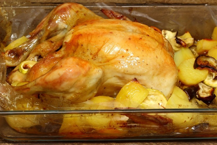 - ضعي الدجاج مع التتبيلة والبطاطس المقطعة في كيس الشواء وضعيه في صينية الفرن.