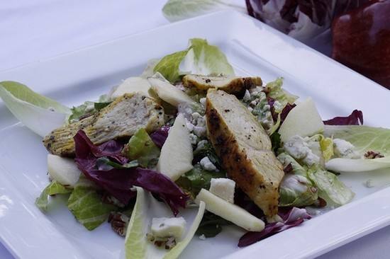 - يوضع الدجاج في وعاء في الفرن لمدة 10 دقائق، ثم يقدّم مغطّى بالسلطة.