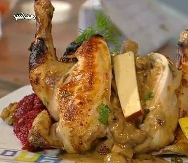 نغسل الدجاج جيداً ثم نضع بداخلها خلطة الجبن والكرفس ونثبتها على حامل