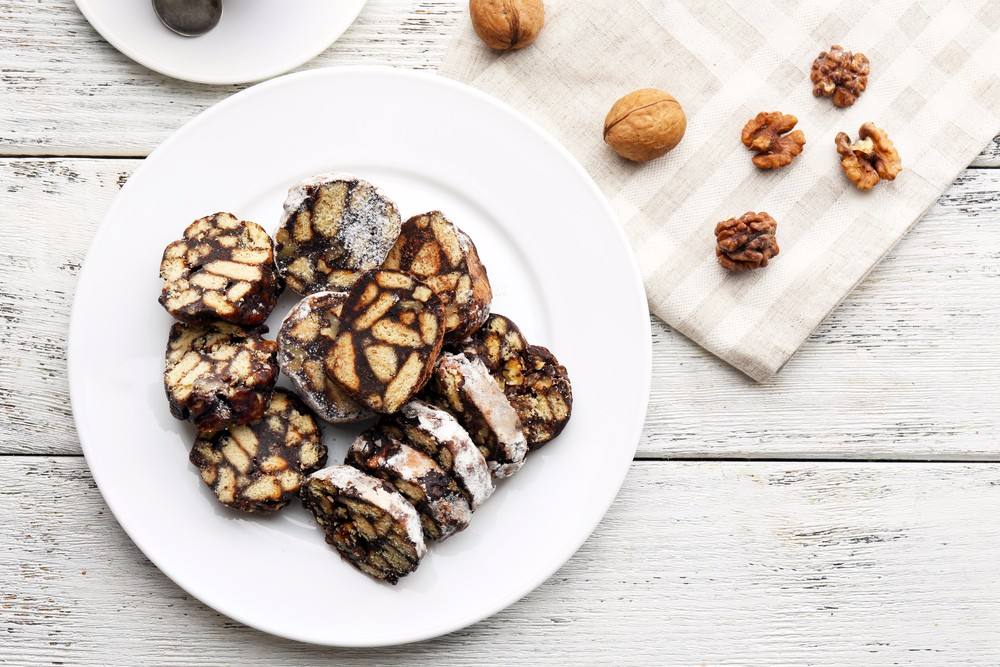 - يوضع البسكويت في وعاء، ويضاف إليه المكسرات، ويخلط جيدا.