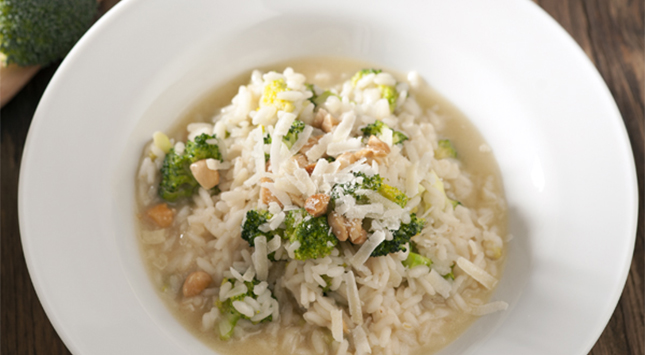يضاف الأرز ويُقلب حتى يتغلف بالزيت. يضاف نصف كمية زهرات البروكولي، ويُترك الخليط على نار هادئة مع إضافة مغرفة واحدة من المرق في كل مرة والتقليب باستمرار حتى يتشرب الخليط المرق تمامًا.