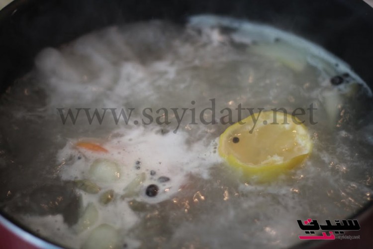 نسلق اللحمة مع بصلة / حبة جزر/ ورق الغار/ فلفل أسود حب/ هيل حب/ بهار حلو حب ونتركه على النار حتى ينضج ثم نزيل اللحم من المرق