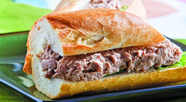 يُقطع خبز الباجيت إلى نصفين، ثم يوضع الخس، ثم يُغرف خليط التونة فوق الخس.
