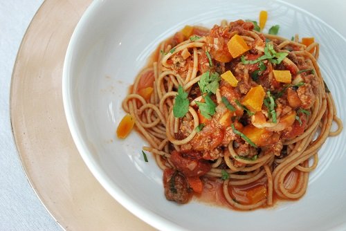 سباغيتي باللحم المفروم طبق بسيط، خفيف، مغذي، وشهي مكون من لحم الخروف المحمص، البصل والفطر مع البندورة والفليفلة الحارة، وجبة غنية تقدم مع طبق من المعكرونة المطبوخة بالطريقة التي ترغبينها.