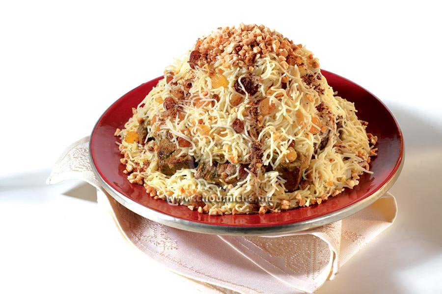 - تطهى الشعرية كما هو مبين في الوصفة، مع إضافة العنب المجفف (الزبيب) إليها خلال المرة الثانية للطهي بالبخار.
