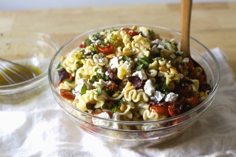 - نضع المعكرونة المسلوقة في وعاء كبير ونضيف إليها بقية المكونات من أوراق الريحان المفرومة، الزيتون الأسود، الصنوبر المحمص وأخيرا لن ننسى جبنة الفيتا والطماطم الكرزية التي قمنا بتحميصها في الخطوة الأولى.