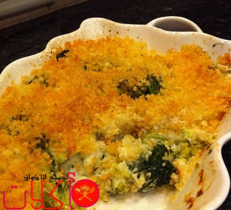 - حركيهم مع البروكلي، ثم اسكبي المزيج في طبق الفرن، ثم اخلطي فتات الخبز مع 2 ملعقة كبيرة من الرومانو وافزشيهم على الوجه، بدون الزبدة.