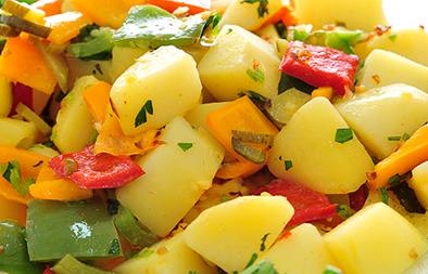 - بعد تقشير البطاطس نقوم بتقطيعها مكعبات صغيرة ونضعها فى طبق به ماء وملح .