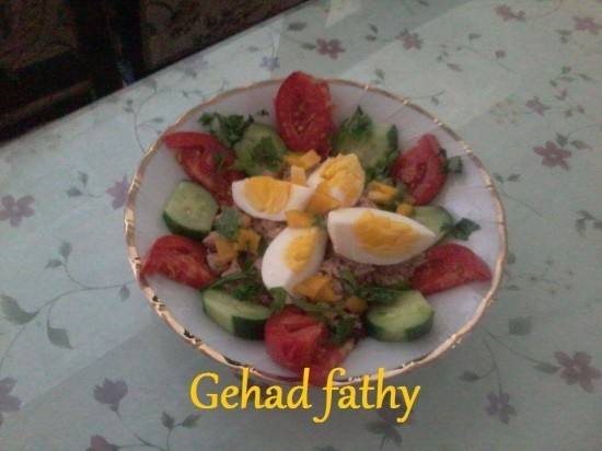 وقت التحضير 0 دقيقة وقت الطهي 0 دقيقة عدد الافراد 0 المقادير تونة مصفاة من الزيت طماطم خيار بيضة مسلوقة ومقطعة للتزيين :فلفل أصفر مكعبات خطوات التحضير يتم خلط المكونات مع بعضها . توضع في طبق التقديم ويتم تزيينها بالفلفل . ثم تقدم .