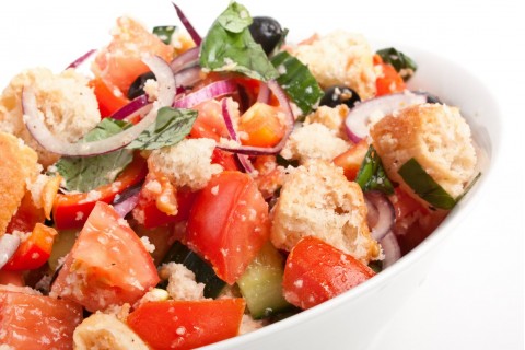 - تكون هنا مكعبات الخبز قد تحمرت بالدرجة المطلوبة، لذلك سنخرجها من الفرن ونتركها لتبرد ومن ثم سنقوم بتوزيعها فوق وعاء التقديم وفوقها أوراق الريحان الطازجة، وأخيراً سنكلل هذه السلطة بالكمية المتبقية من التتبيلة وتكون سلطة الخبز الايطالية جاهزة للتقديم.