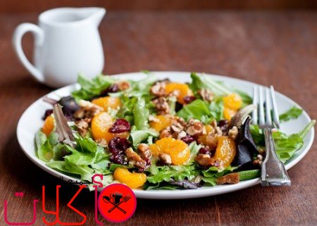 سلطة خضار بالبرتقال طبق مغذي غني بالفيتامينات والمواد الصحية، يمكنك اختيار تشكيلة الخضار التي تفضلينها أو المتوافرة في، مطبخك بالاضافة إلى قلوب النخيل، برتقال المندرين، صوص الخل وزيت الزيتون، ويرش على الوجه كل من الجبنة المفتتة والجوز المفروم مع شرائح الخيار.