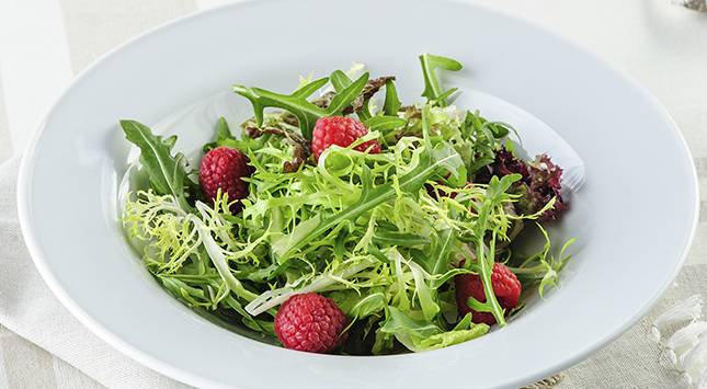 توضع الأوراق الخضراء في وعاء كبير، وتُقلب مع ⅔ التتبيلة. تُقسم الأوراق الخضراء بين 4 أطباق. يُضاف التوت الأحمر إلى الوعاء، ثم يُقلب مع الكمية المتبقية من التتبيلة وتُقدم مباشرة.