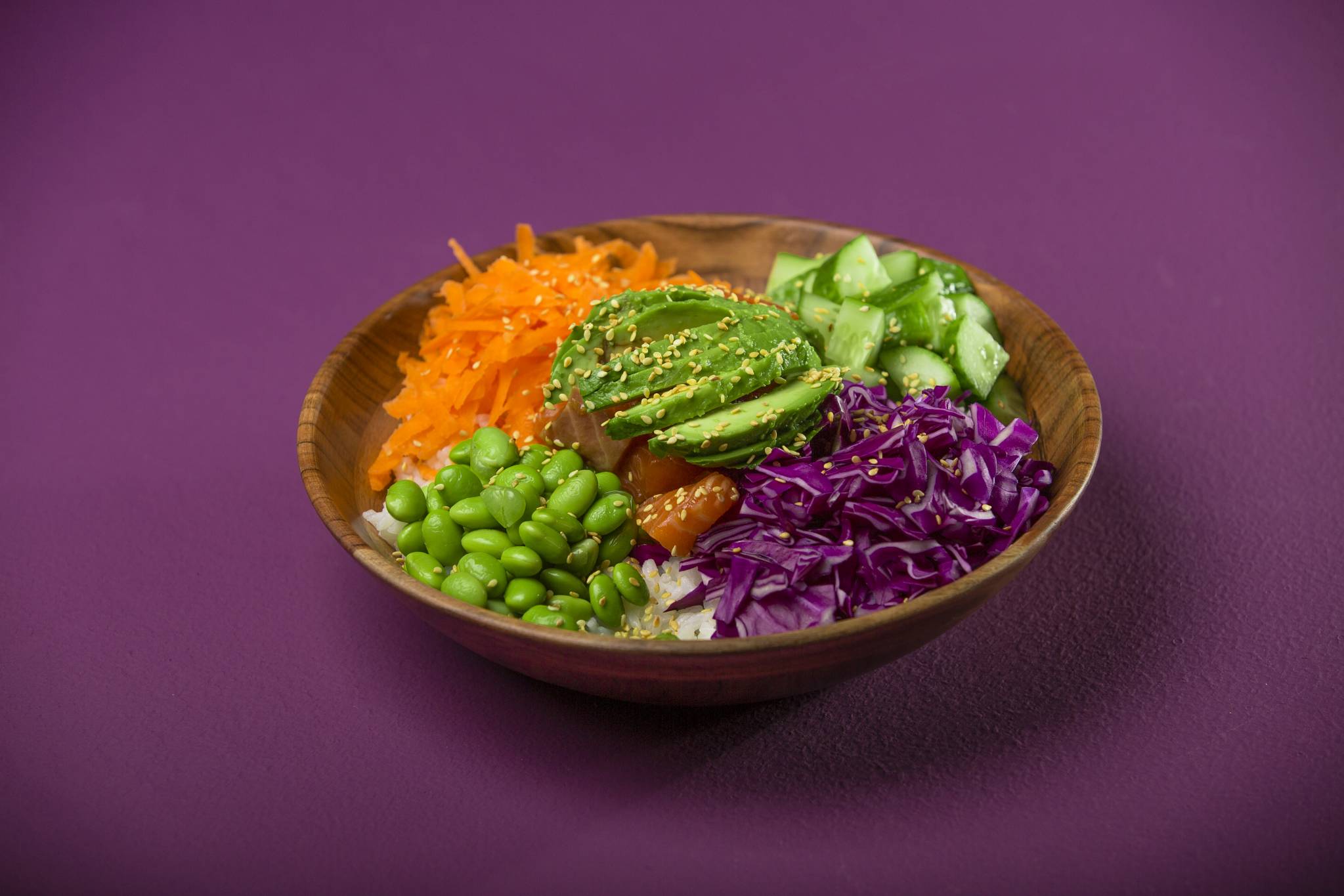 يوضع الأرز في وعاء، ثم يوضع الأفوكادو والجزر والملفوف وفول الصويا والخيار والسلمون على الوجه. يشرب ببقية التتبيلة ويرش بالسمسم.