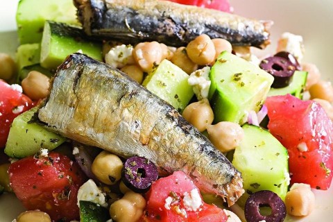 - نغرف الخضر فى وعاء التقديم ثم نوزع فوقها الجبن والسردين ثم نوزع التتبيلة تقدم بارده بالهنا والشفا.