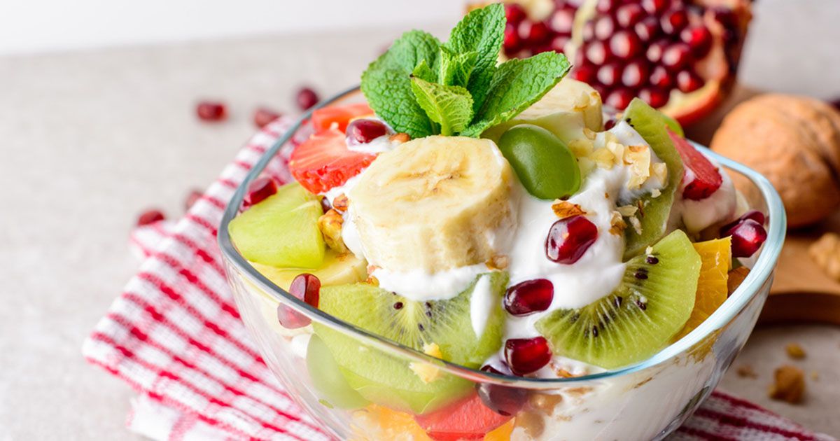 2- في وعاء، ضعي الموز، الكيوي، الفراولة، بذور الرمان، البرتقال والعنب.