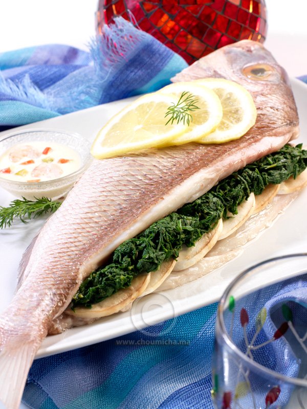 - يرش قليل من الملح والفلفل داخل السمكة. تحشى السمكة بطبقة أولى من الفطر وطبقة ثانية من السبانخ. تطهى السمكة في الفرن المسخن على درجة الحرارة 170 لمدة 30 دقيقة تقريبا.
